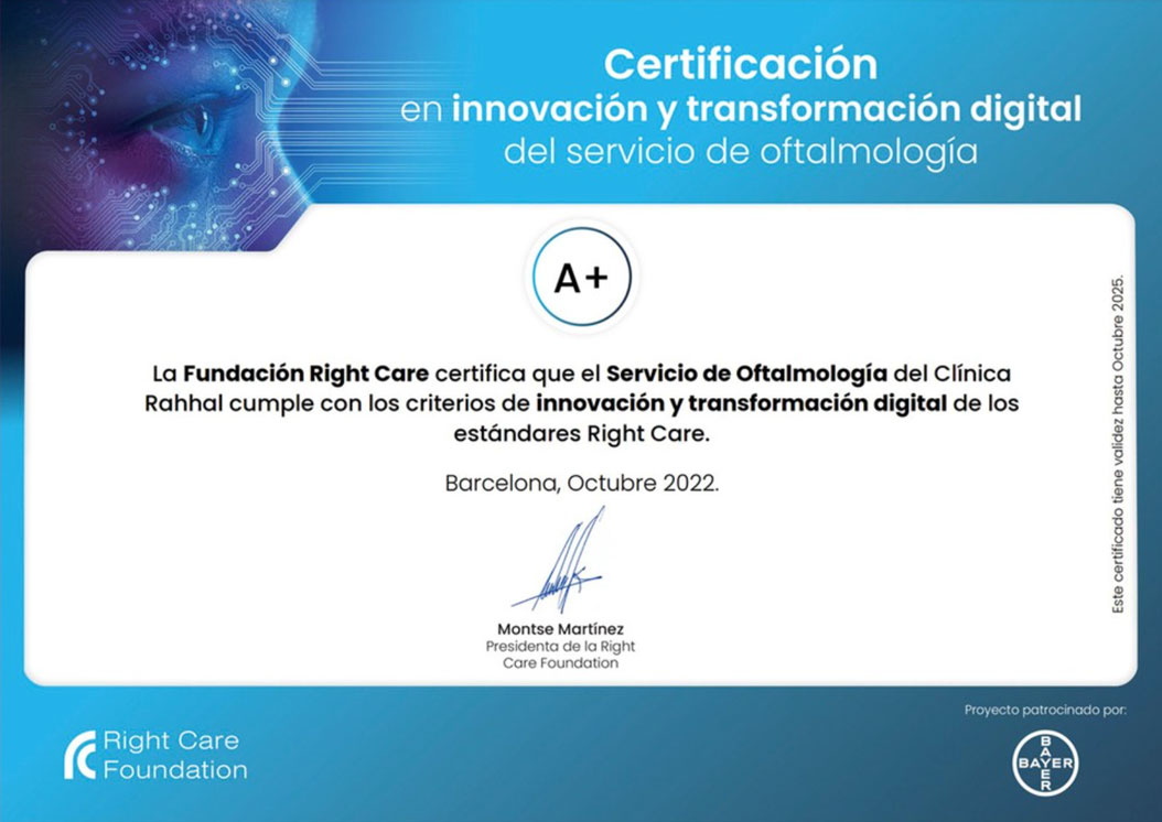 At Clínica Rahhal, we hold the Certification in Innovation and Digital Transformation, which recognizes our commitment to implementing the most advanced technologies in the field of ophthalmology.